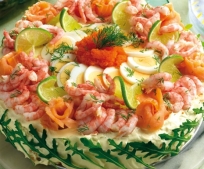 Prøv ex. den svenske specialitet "Smörgåstårta", det er en "Sandwichkage" eller "Smørrebrødstærte"